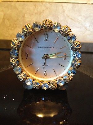 Title (ebay affiliate link): ANTIQUE VINTAGE ALARM CLOCK PHINNEY WALKER JEWELED BLUE RHINESTONE GOLD TONE