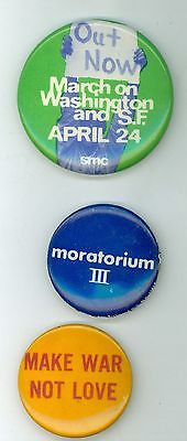 Title (ebay affiliate link): 3 Vintage 1960s 70s Anti War Vietnam Peace Political Protest Pinback Buttons Out