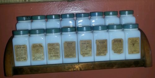 Retro milk glass spice bottles and holder