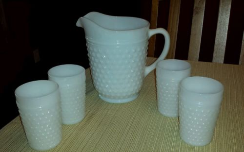 Title (ebay affiliate link): 5 Piece Milk White Hobnail & Bars Pitcher & Glasses Estate Find