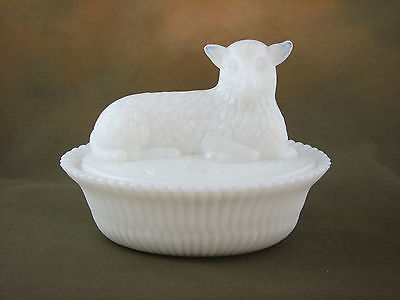 Title (ebay affiliate link): Rare Vintage McKee Milk Glass Covered Dish ~ Lamb on Split Reed Base