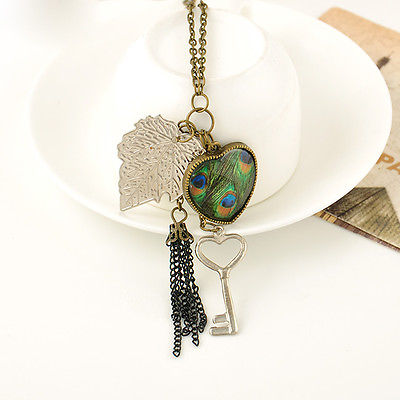 Title (ebay affiliate link): Vintage Fashion Heart Leaf Key Peacock Tassel Bronze Long Chain Sweater Necklace