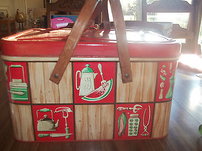 Title (ebay affiliate link): Old Vintage Metal Picnic Basket ~ Rustic Shabby Prim Farm Kitchen Decor Luggage