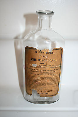 ANTIQUE APOTHECARY MEDICINE BOTTLE,PAPER LABEL CALCIUM CHLORIDE ELIXIR