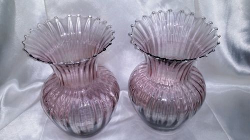Title (ebay affiliate link): A Pair of Matching Art Glass Pale Pink Stripped Depression era Vases 7.5"