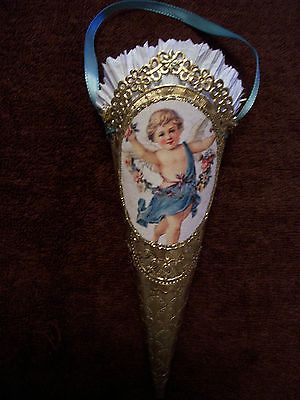 VintageLookChristmasConeOrnament,BlueAngel,handcrafted,scrap,tinsel,paper