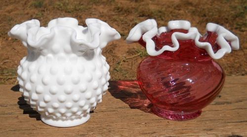 Title (ebay affiliate link): 2) Vintage Fenton Art Glass VASES Milk Glass Hobnail Cranberry Snowcrest Spiral