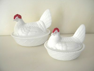 TWO VINTAGE WESTMORELAND MILK GLASS HEN ON A NEST/BASKET