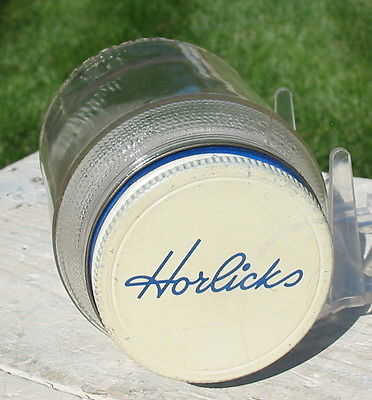 Title (ebay affiliate link): Rare Unusual Horlick Small Malted Milk Glass Jar Metal Lid Container Advertising