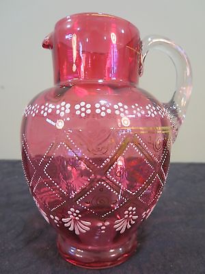 GORGEOUS ORIGINAL VICTORIAN ANTIQUE ENAMELED GILT CRANBERRY GLASS WATER PITCHER