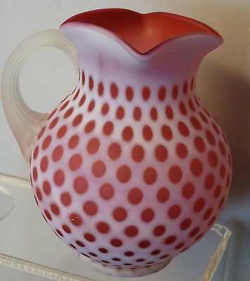 SATIN CRANBERRY OPALESCENT COIN DOT WINDOWS PATTERN APPLIED HANDLE SQUARE TOP