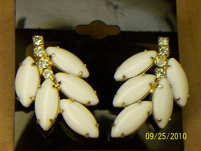 ATTRACTIVE VINTAGE WHITE MILK GLASS/RHINESTONE EARRINGS