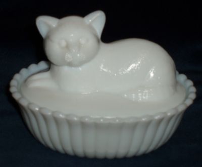 Milk Glass Cat Basket Covered Candy Dish Kitten Marked