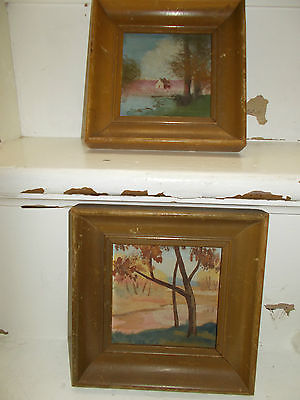 Vintage oil paintings Two Small Frames Primitive Cabin Lake River Mountain Naive