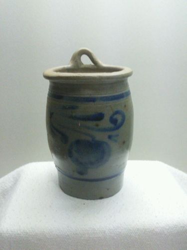 Antique Blue Decorated Stoneware Crock With hanging loop
