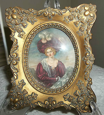 ORNATE BARBOLA FRAME CURVED GLASS,"LEONORA" LADY PRINT VICTORIAN DRESS,HAT WOW!