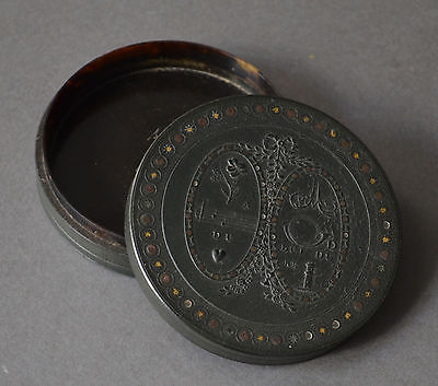 FRENCH 19TH CENTURY LACQUER PAPIER MACHE ROUND BOX REBUS HIEROGLYPH TURTLE INNER