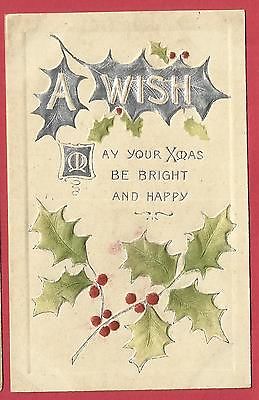 Christmas embossed postcard/silver leaves/ holly & berries/