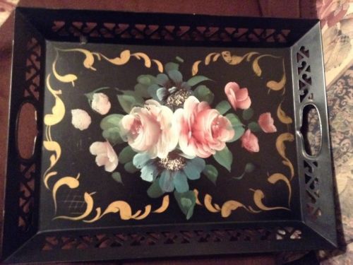 Vintage Tole Tray French Country Hand Painted Pink White Roses