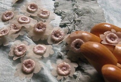 Title (ebay affiliate link): Antique LOT/20 Tiny Organdy/Lavender Embroidered Flower Motifs DOLLS/Hats 3/4"