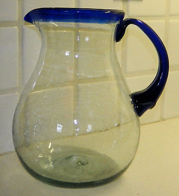 Vintage Hand Blown Mexican Glass Pitcher Cobalt Blue Rim and Handle