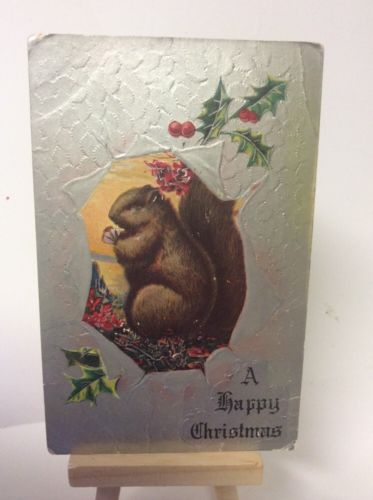 Title (ebay affiliate link): Antique 1909 Christmas Post Card Squirrel Holding Nut Silver Foil Background