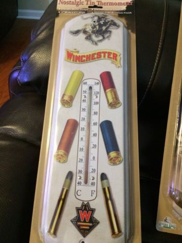 Title (ebay affiliate link): NEW IN PACKAGE NOSTALGIC RIVERS EDGE TIN THERMOMETER WINCHESTER WHITE