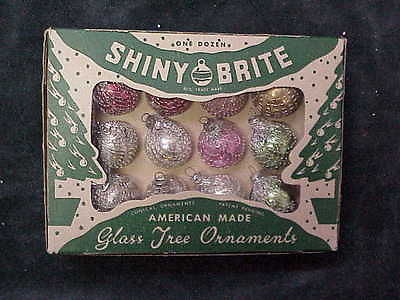 12 Shiny Brite Silver Mesh Covered Feather Tree Glass Christmas Ornaments, Box