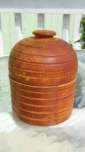 Vintage round treen wood trinket box. Bee skep shaped