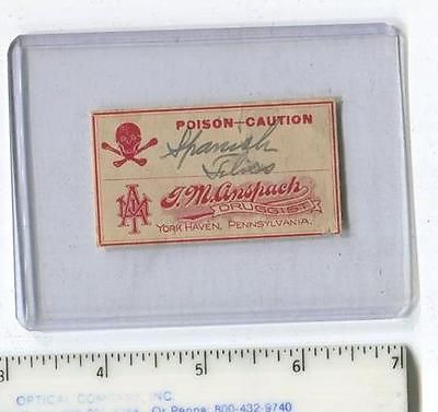 Poison SPANISH FLY Old Medicine Bottle LABEL Anspach Druggist YORK HAVEN PA
