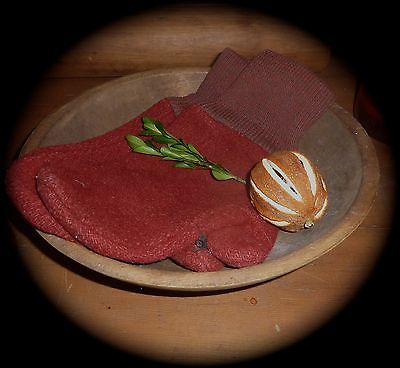 Primitive Red Wool Mittens and Wood Bowl ~ bowls