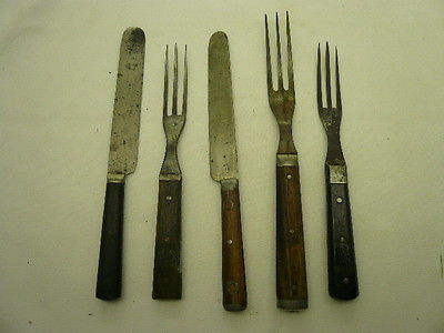 5 Vintage 3 Tine Wood Handled Forks & Knifes Lot 346