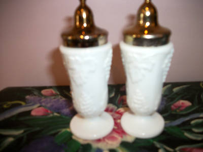 MILK GLASS GRAPE LEAF PATTERN SALT AND PEPPER SHAKERS