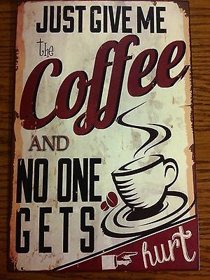GIVE ME COFFEE AND NO ONE GETS HURT VINTAGE LOOK HUMOR METAL SIGN COFFEE SHOP