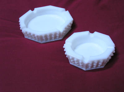 Milk glass hobnail pair of nestling ash trays, excellen