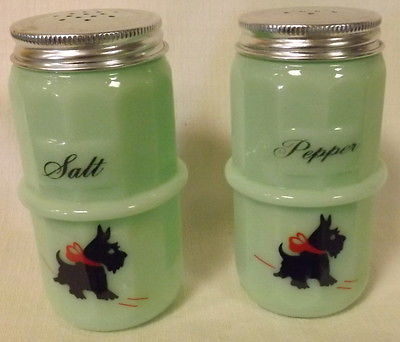 Title (ebay affiliate link): Jade Jadite Milk Green Glass Hoosier Style Salt Pepper Shaker Set Scottie Dogs