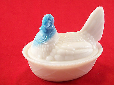 VTG WESTMORELAND WHITE & BLUE MILK GLASS HEN ON NEST UNMARKED