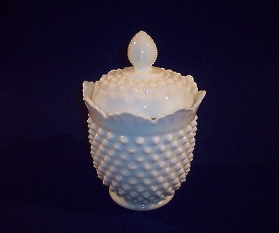 Title (ebay affiliate link): Vintage FENTON White Milk Glass Hobnail Tall Candy Dish Canister w/ Lid Ruffle