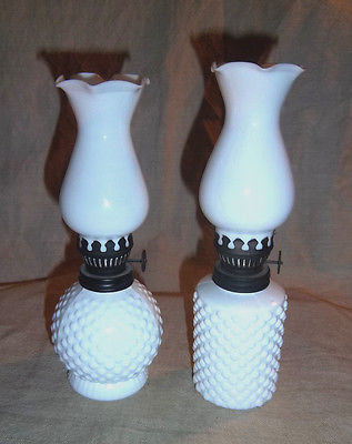 Title (ebay affiliate link): Pair / Set Of Vintage Japan Hobnail Milk Glass Miniature Oil Lamps W/ Chimneys