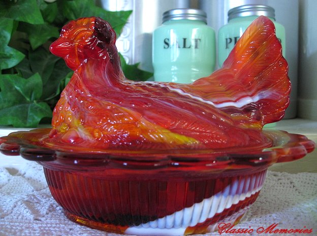 RUBY RED ~ ORANGE & MILK SLAG Glass HEN CHICKEN on NEST