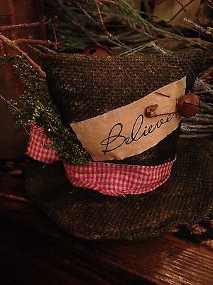 Primitive Country Grubby Burlap Snowman Hat Tag Believe Rusty Bell Homespun Tie