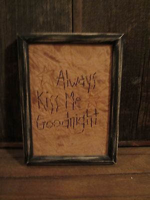 PRIMITIVE GRUNGY HANDMADE 'ALWAYS KISS ME GOODNIGHT' SAMPLER WITH WOOD FRAME