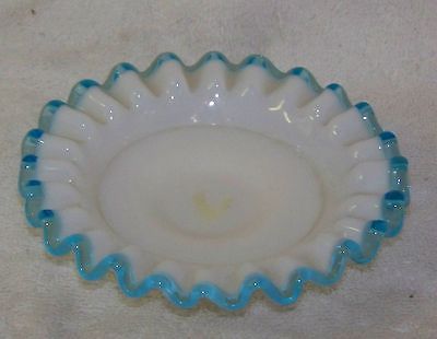 MILK GLASS W/BLUE RUFFLE CANDY DISH DEPRESSION