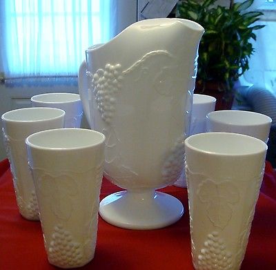 Title (ebay affiliate link): Vintage COLONY White Milk Glass "Harvest Grape " Large Pitcher & 6 Tall Glasses