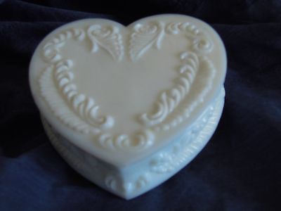 Vintage Milk Glass Heart Shaped Trinket Box - Scrolled with Feathers