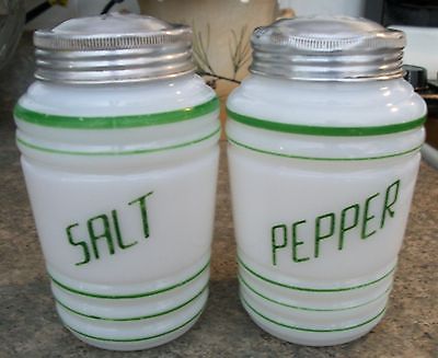 HAZEL ATLAS MILK GLASS RANGE SHAKERS SALT PEPPER GREEN LINES LETTERING BEHIVE