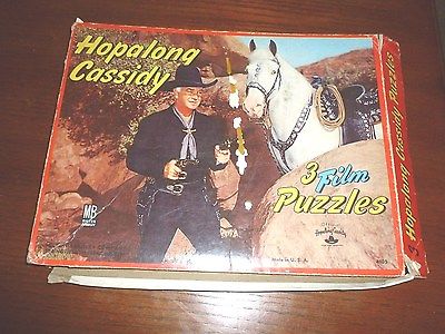Title (ebay affiliate link): 1950's HOPALONG CASSIDY 3 FILM PUZZLE MILTON BRADLY W/BOX COMPLETE