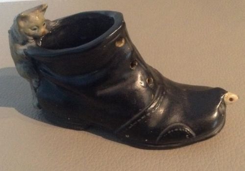 Antique German Cat Mouse In A Shoe Boot Match or Toothpick Holder