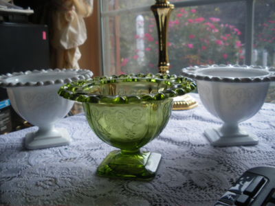 3 SMALL OPEN LACE BOWLS VINTAGE 1 GREEN 2 MILK GLASS