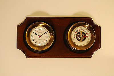 STUNNING ANTIQUE 1970s BULKHEAD STYLE CLOCK & ANEROID BAROMETER SET ON MAHOGANY